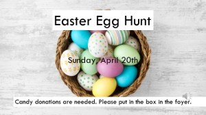 Our Easter Egg Hunt is scheduled for Sunday, April 20th, after Sunday Morning Service. We need candy donations. There is a collection box in the foyer. Please no chocolate because it will melt.